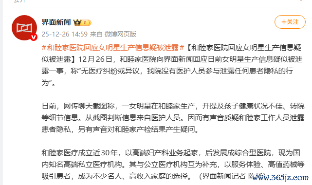 12月26日,和睦家医院向界面新闻回应日前女明星生产信息疑似被泄露一事,称“无医疗纠纷或异议,我院没有医护人员参与泄露任何患者隐私的行为”。