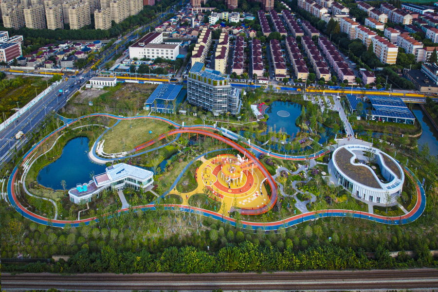 市园林院所在的长三角一体化绿色科技示范楼,是目前上海市最大单体的零能耗建筑,与相邻生态公园“李子园公园”实现了“绿色零碳”联动。