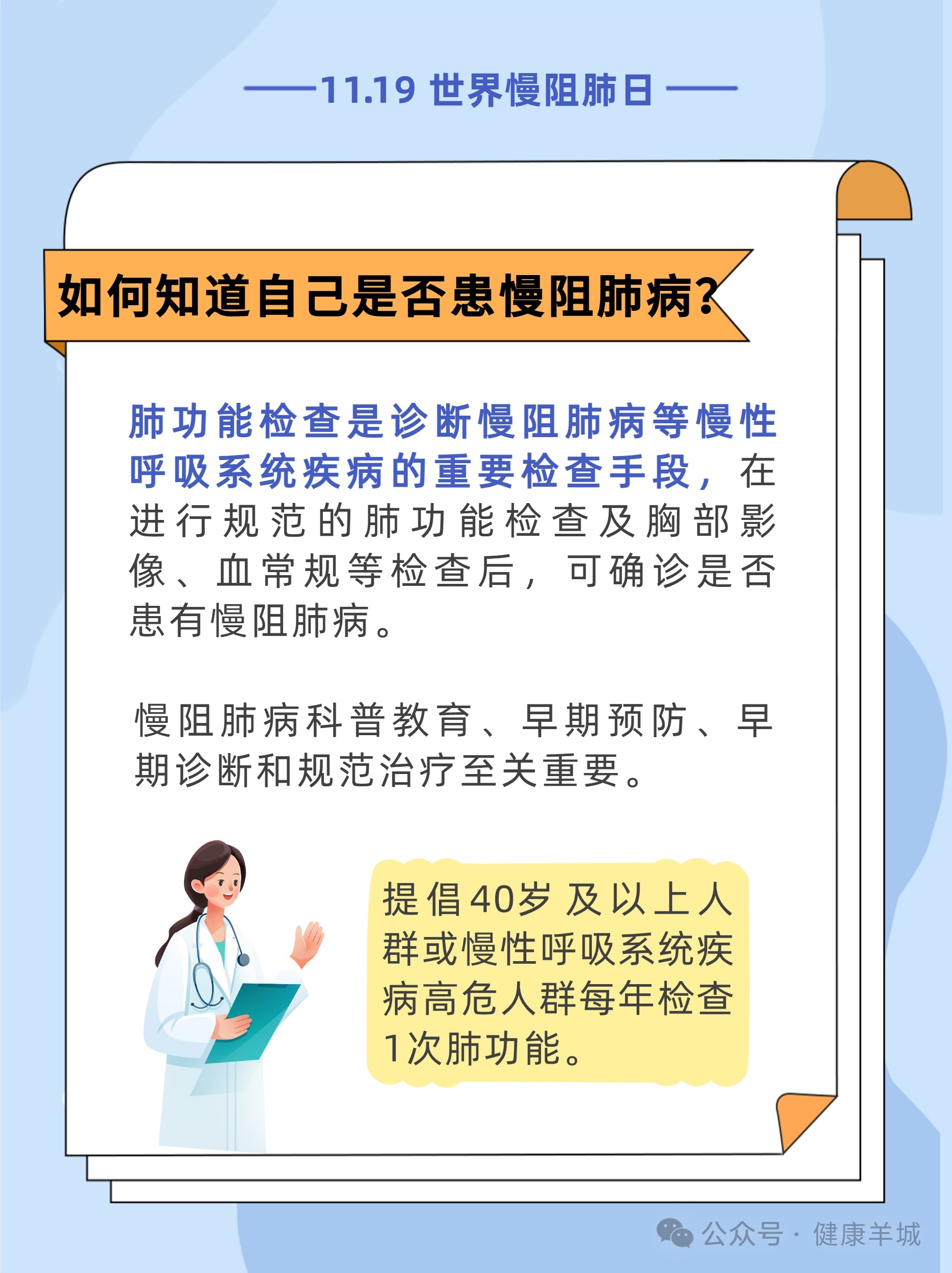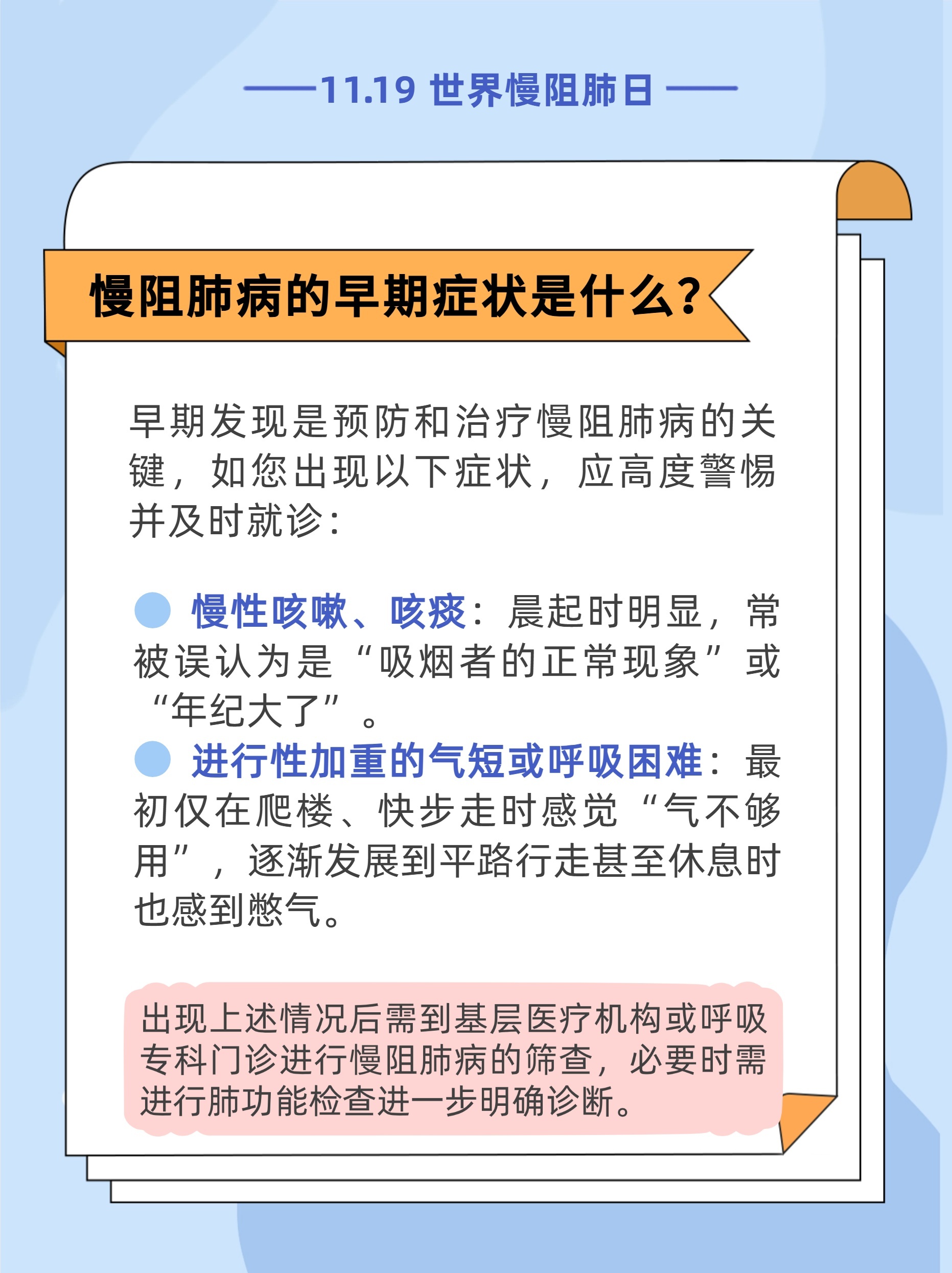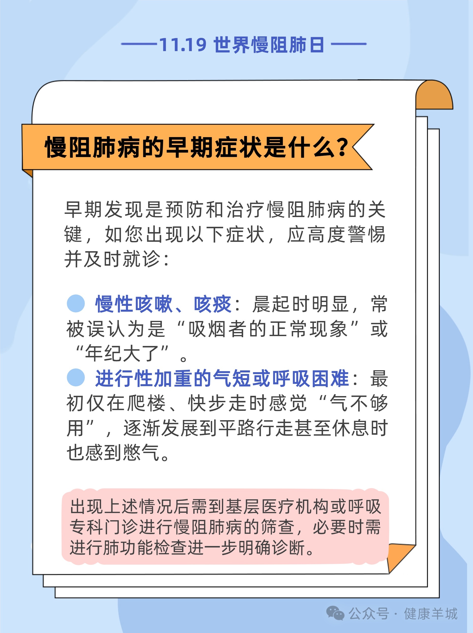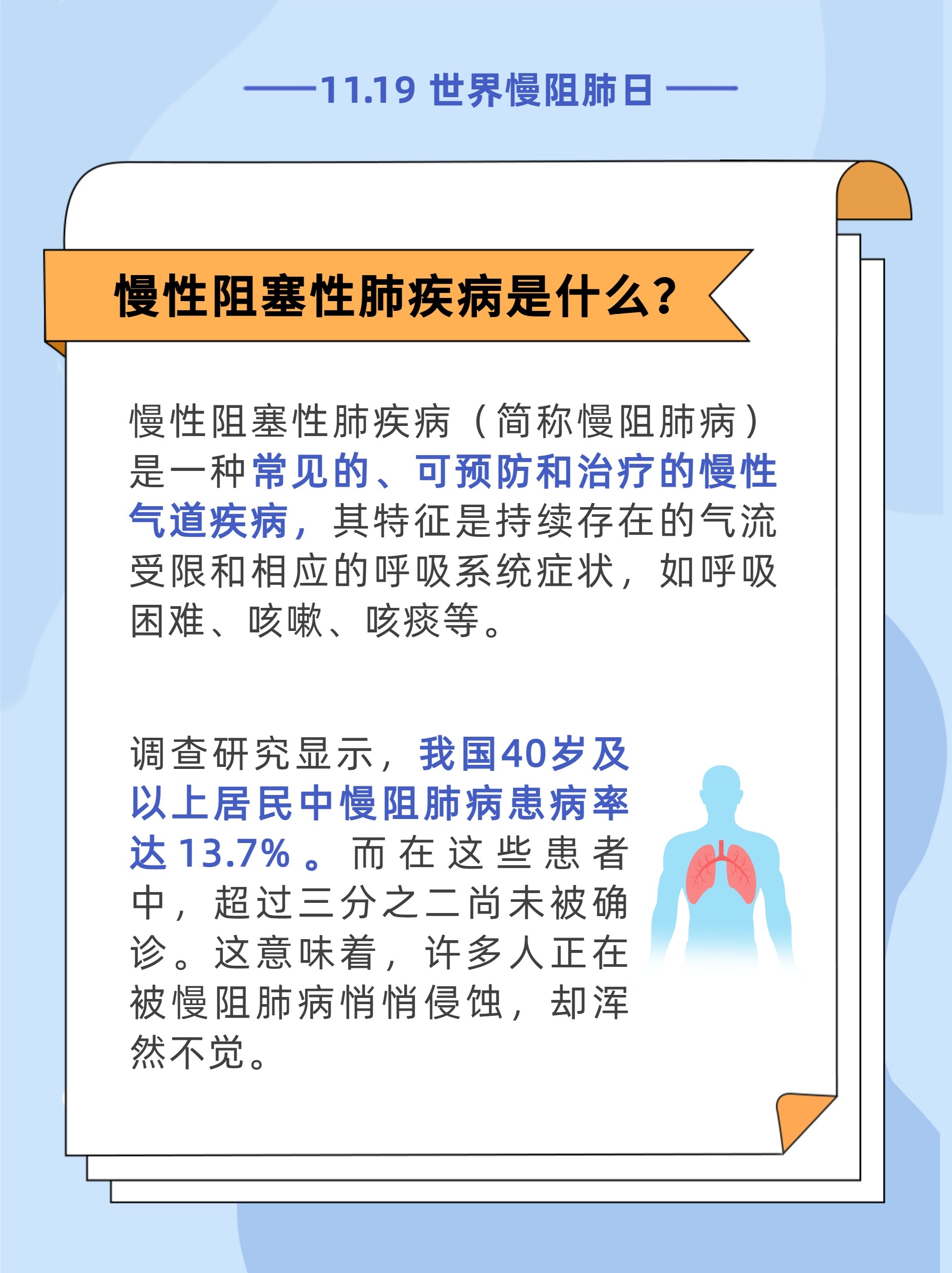 #世界慢阻肺日11月19日是世界慢阻肺日盈为国际,今年的活动主题是“呼吸不畅,当心慢阻肺病”,旨在提高公众对慢阻肺病的认知和重视。[惊讶]调查研究显示,我国40岁及以上居民中慢阻肺病患病率达13.7%。也就是说,每8人里就可能有1人患有慢阻肺病。而在这些患者中,超过三分之二尚未被确诊。这意味着,许多人正在被疾病悄悄侵蚀,却浑然不觉。[生病]如果您存在长期反复地咳嗽、咳痰,活动后(如爬楼梯)出现气短、呼吸困难,尤其是吸烟者,要特别留意可能存在慢阻肺,建议您尽早到医院做肺功能检查。内容来源:国家卫生健康委官网、健康报编辑/制图:李慧敏责编:梁晓珊审核:王志伟