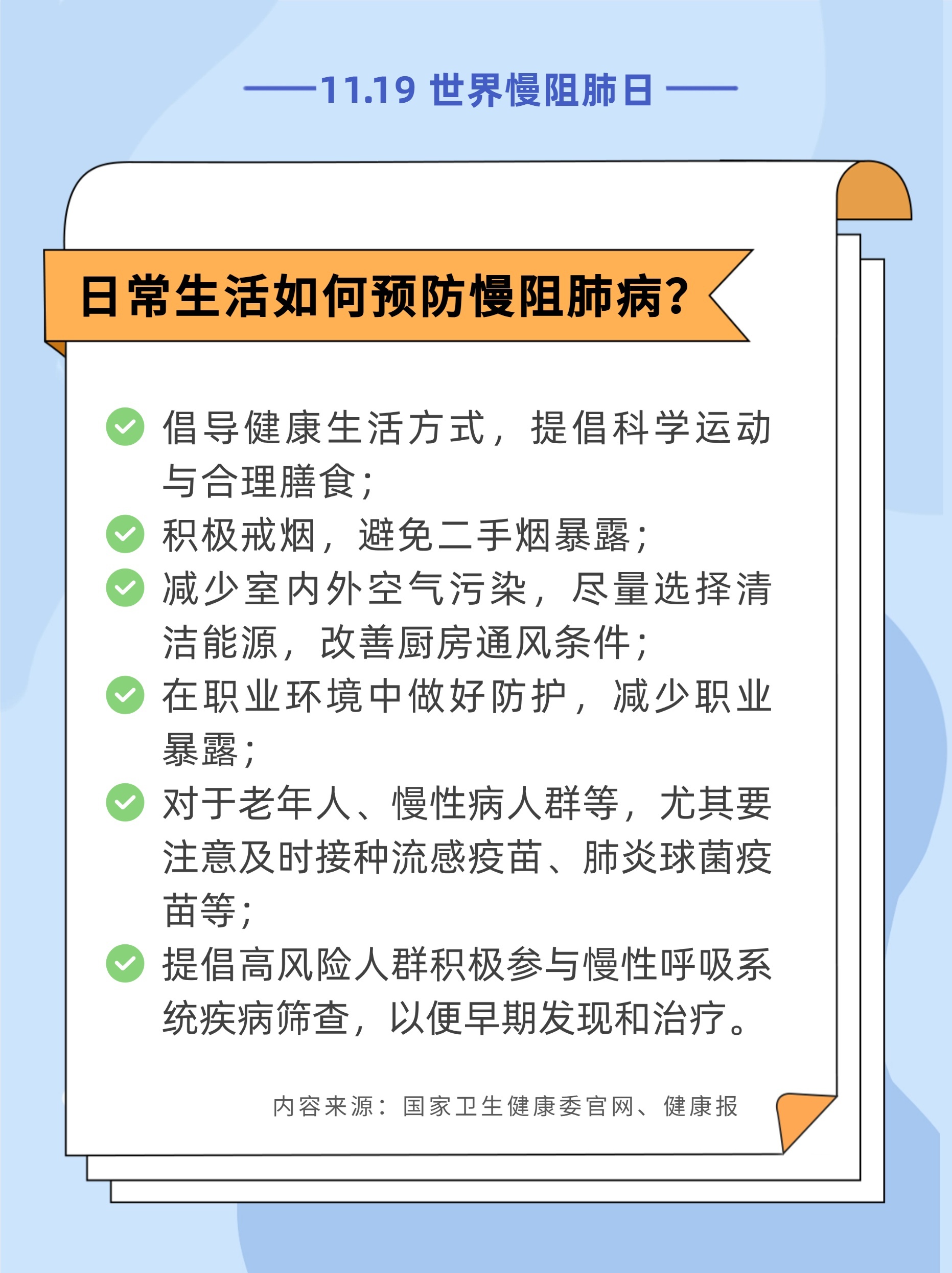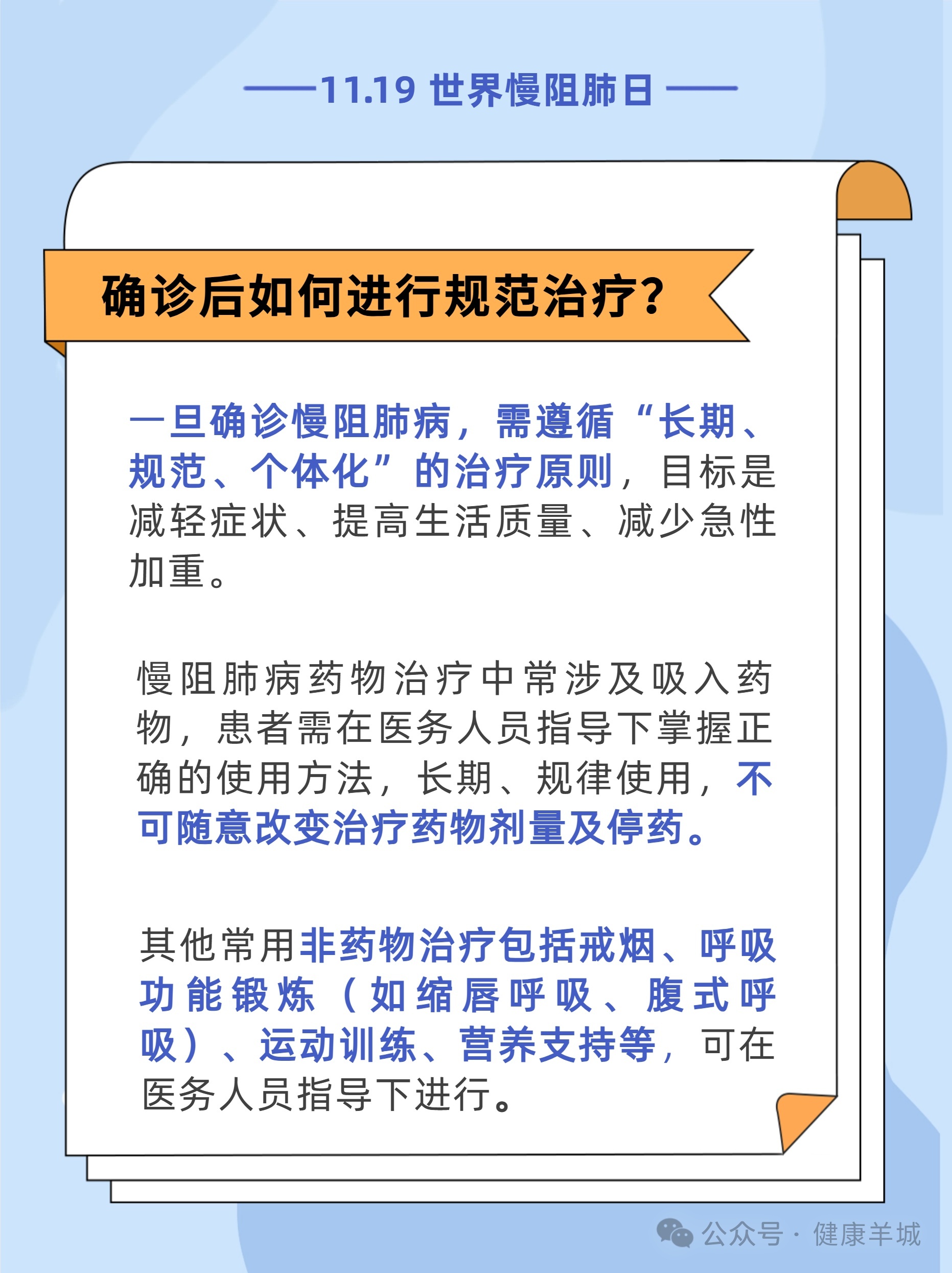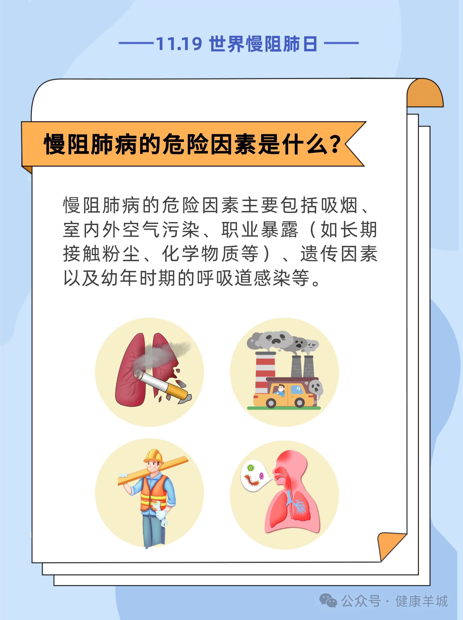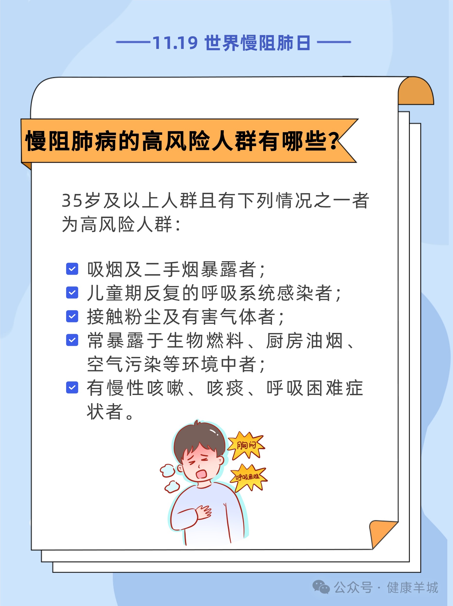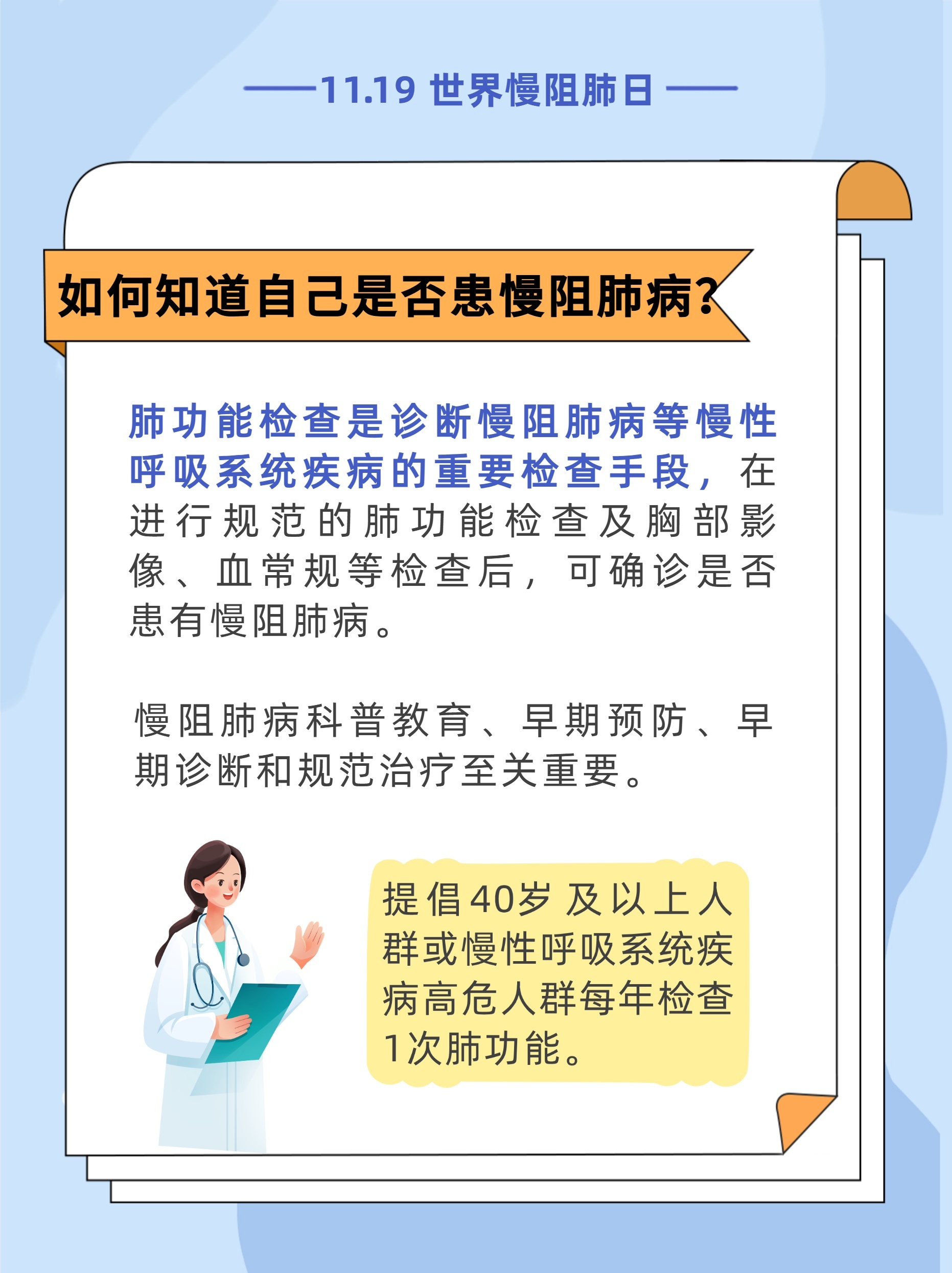 #世界慢阻肺日11月19日是世界慢阻肺日盈为国际,今年的活动主题是“呼吸不畅,当心慢阻肺病”,旨在提高公众对慢阻肺病的认知和重视。[惊讶]调查研究显示,我国40岁及以上居民中慢阻肺病患病率达13.7%。也就是说,每8人里就可能有1人患有慢阻肺病。而在这些患者中,超过三分之二尚未被确诊。这意味着,许多人正在被疾病悄悄侵蚀,却浑然不觉。[生病]如果您存在长期反复地咳嗽、咳痰,活动后(如爬楼梯)出现气短、呼吸困难,尤其是吸烟者,要特别留意可能存在慢阻肺,建议您尽早到医院做肺功能检查。内容来源:国家卫生健康委官网、健康报编辑/制图:李慧敏责编:梁晓珊审核:王志伟