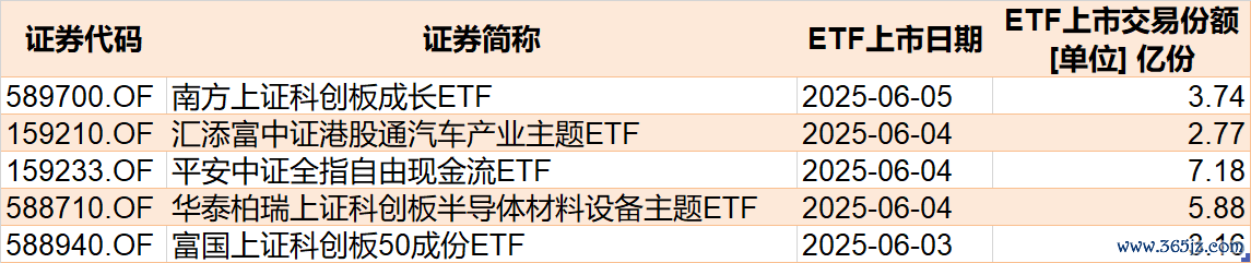目前已有5只ETF披露下周发行,跟踪标的为科创板成长、港股通汽车、自由现金流、科创半导体材料、科创50等。