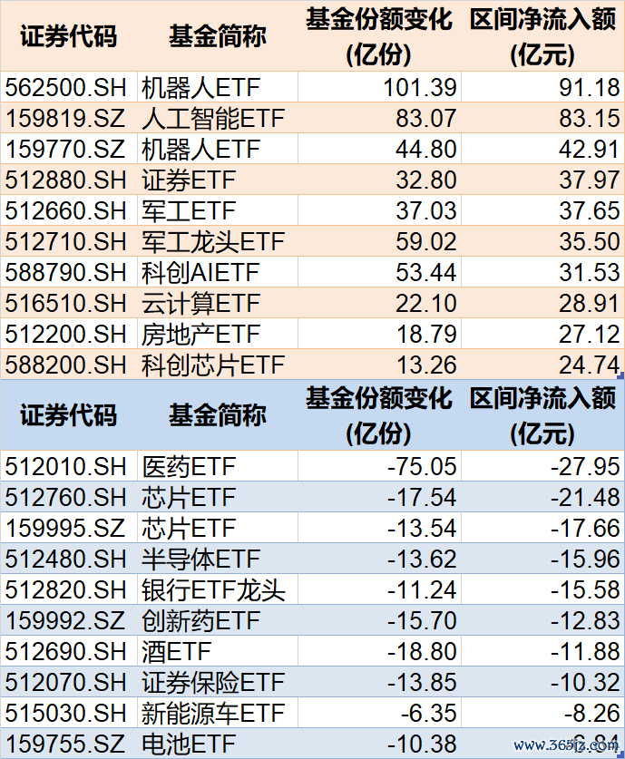 行业主题上看,机器人、人工智能相关ETF被资金看好,而医药、芯片相关ETF被资金抛售。