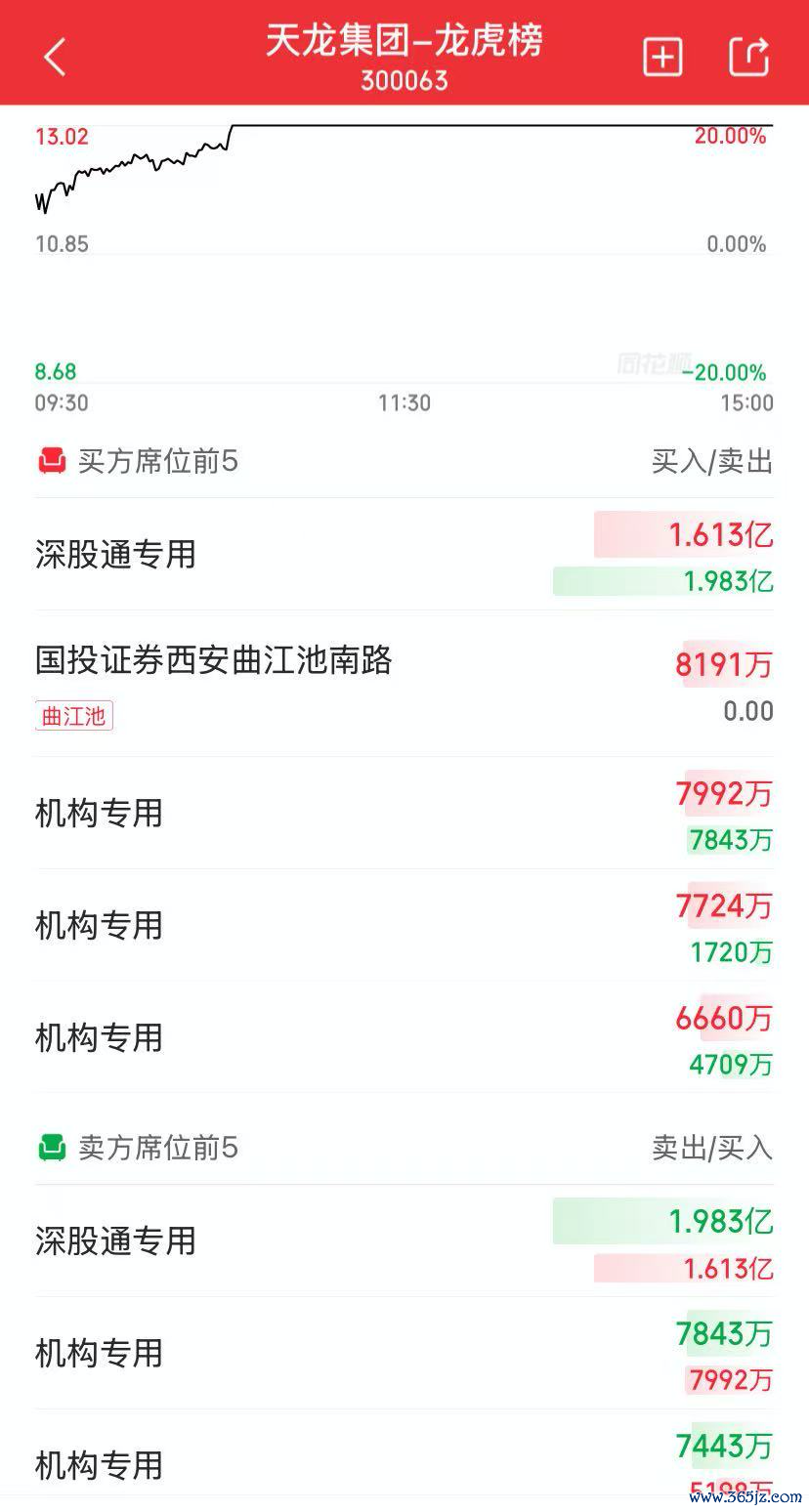 天龙集团今日收报13.02元,涨幅为20%,换手率37.53%,成交额28.60亿。1月9日至1月12日,该股期间涨幅44.03%,累计偏离值39.73%,区间成交额56.20亿。天龙集团今日龙虎榜席位除被个别游资占据外,其余均为深股通专用席位和机构专用席位。