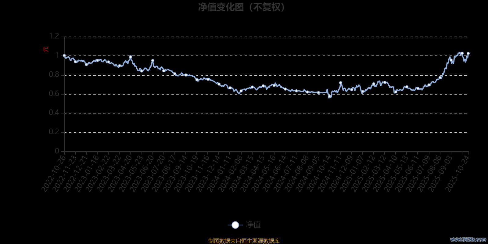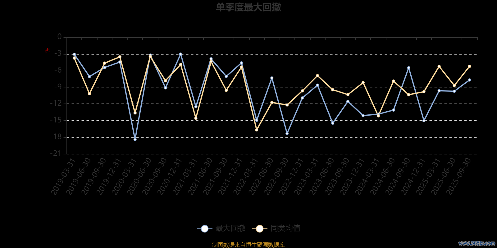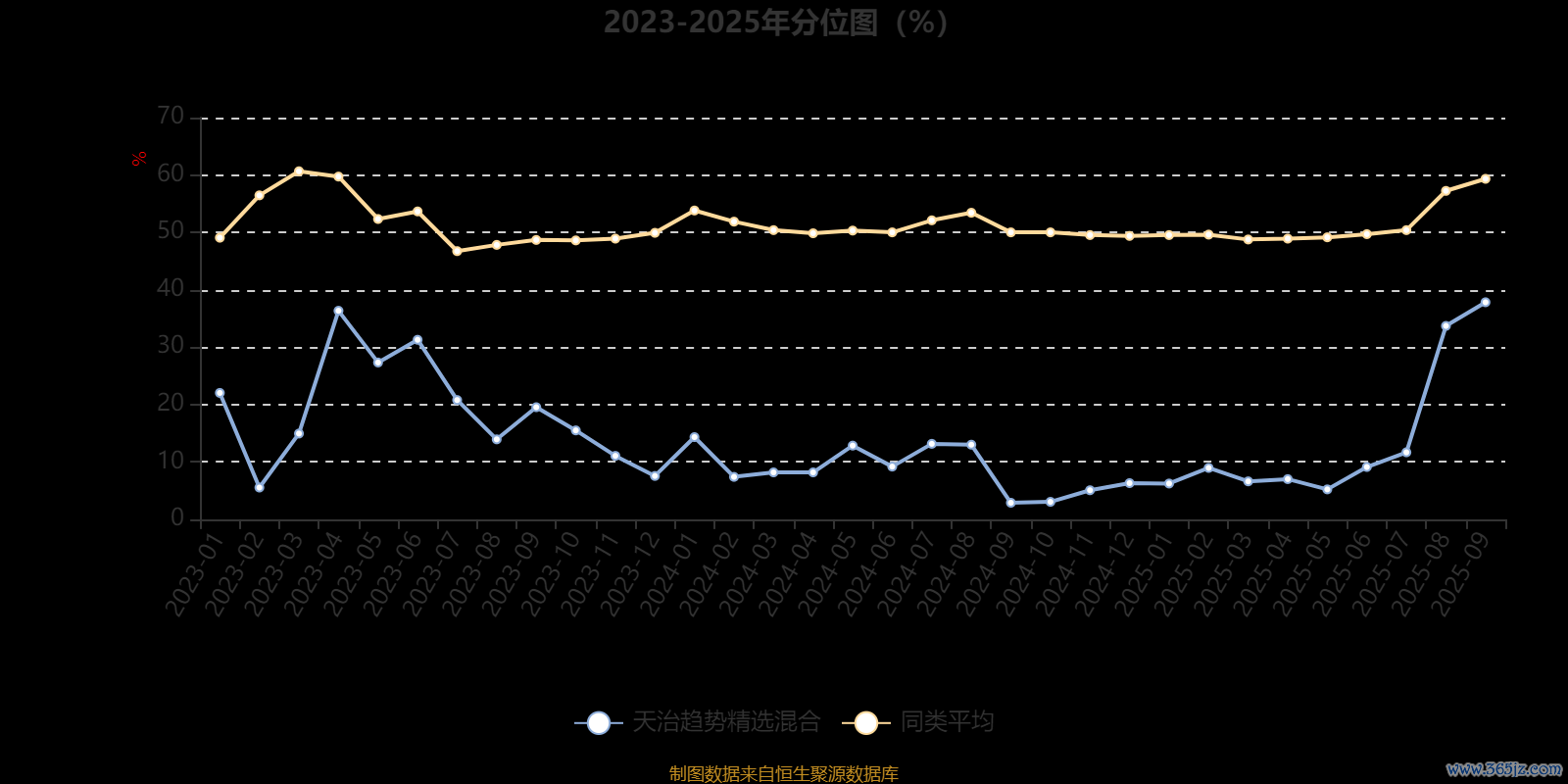 通过所选区间该基金净值增长率分位图,可以观察该基金与同类基金业绩比较情况。图为坐标原点到区间内某时点的净值增长率在同类基金中的分位数。