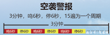 空袭警报信号:鸣6秒,停6秒,反复15遍为一个周期,时间3分钟;
